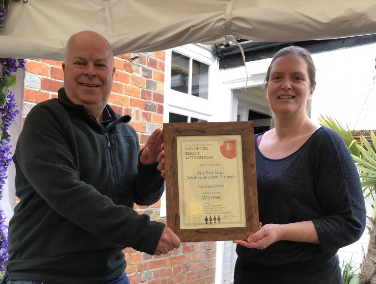 Many congratulations to Corinne, husband Mouse (pictured, together with our Chairman Graham Hards), and all of the staff at the Red Lion, Brightwell-cum-Sotwell, who have been awarded our branch Pub of the Season for Autumn.