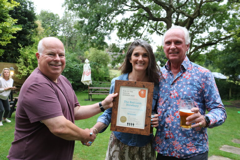 A good handful of branch members together with, it seemed, most of Blewbury turned out on the evening of the 8th August to celebrate the presentation of our Pub of the Season for Summer 2024 award to Annabel Cochrane and John Hunter, owners of the Red Lion in Blewbury (pictured with our branch Chairman, Graham Hards. Photo courtesy of Bob Smith).